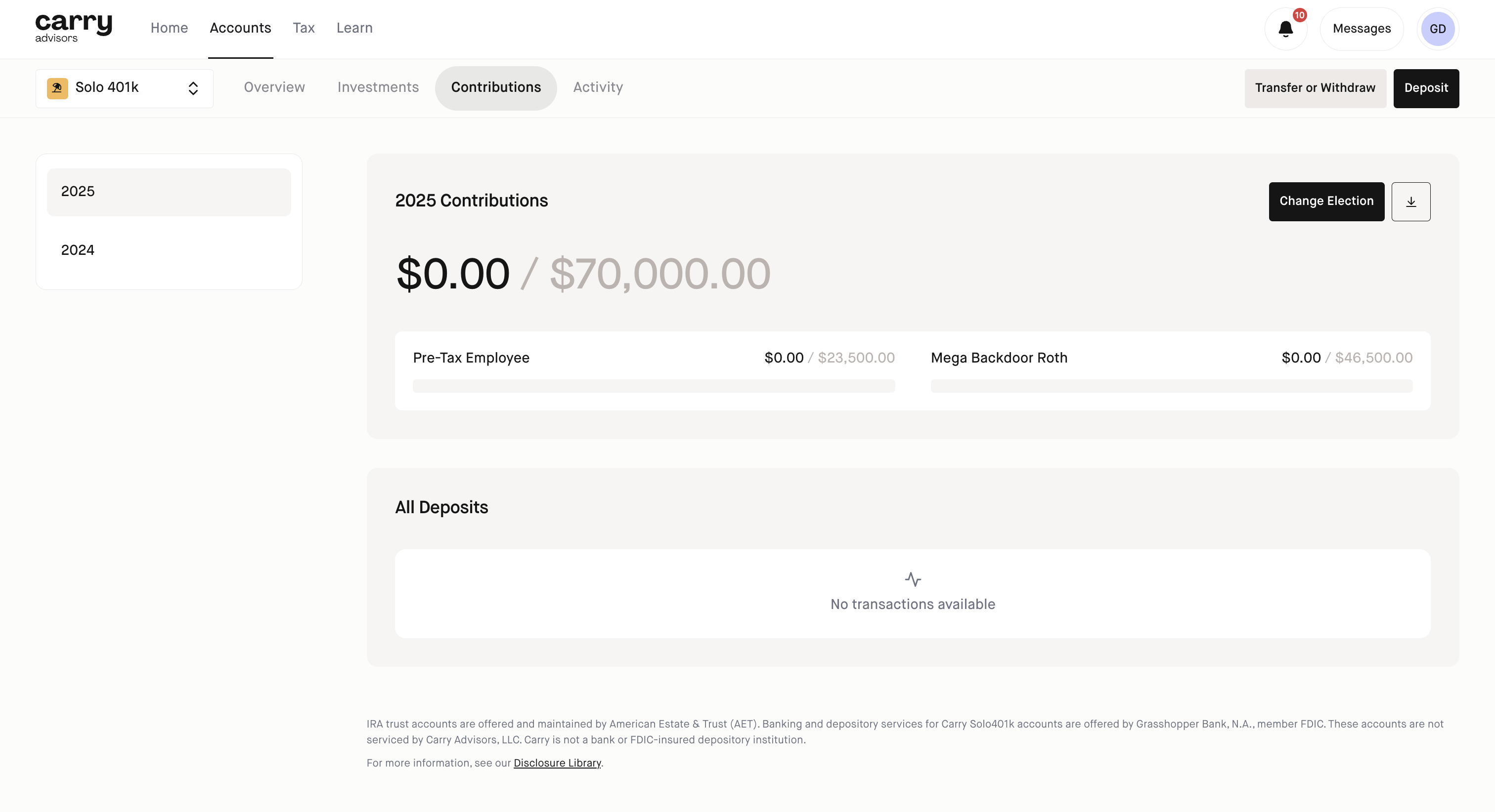 Step 1: If you don't already have it enabled, in your Solo 401k account, click 'Contributions' tab, then "Change Election"