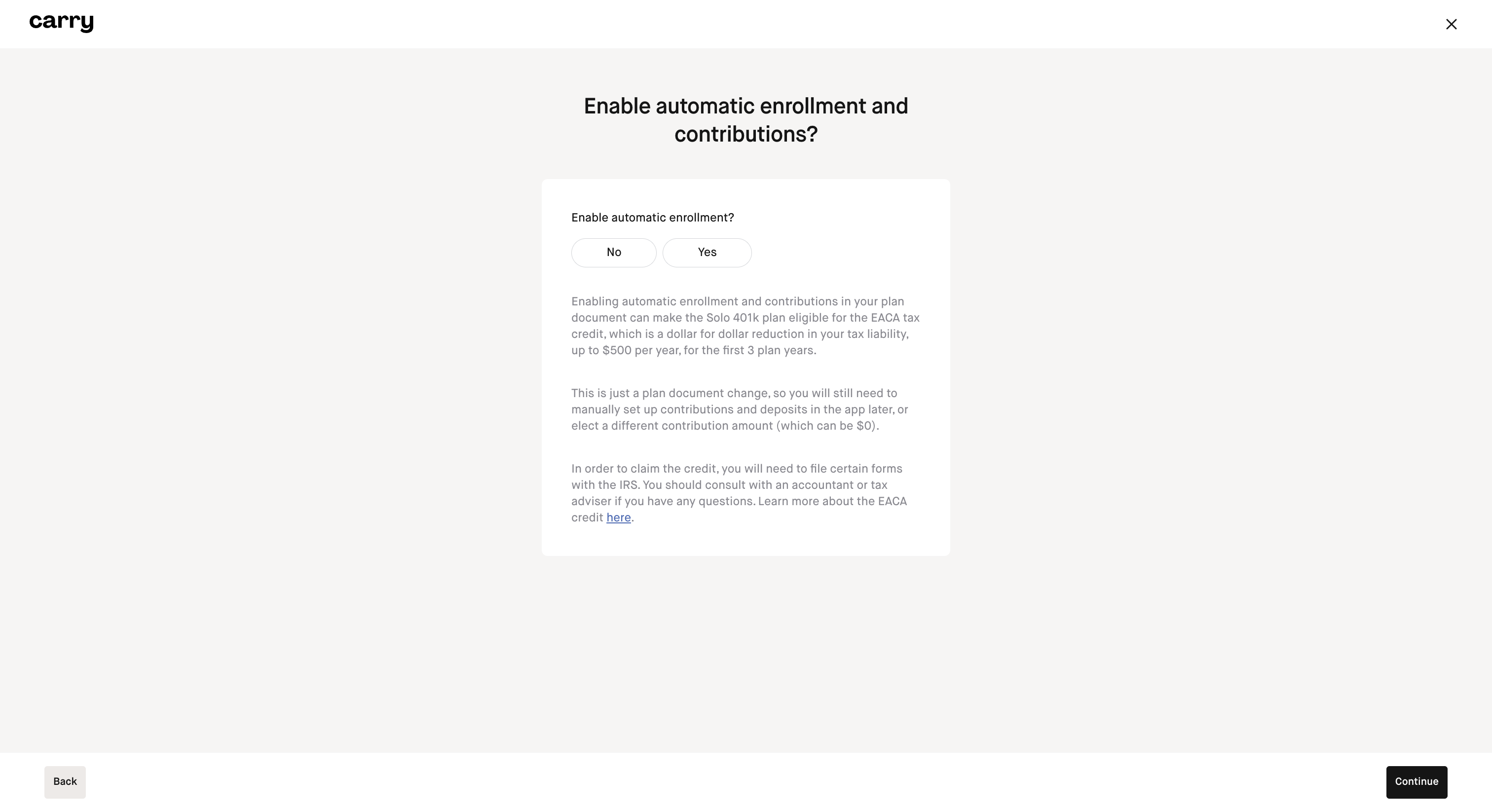 Step 6: Answer whether to enable automatic enrollment and contributions to be eligible for the EACA credit and click 'Continue'