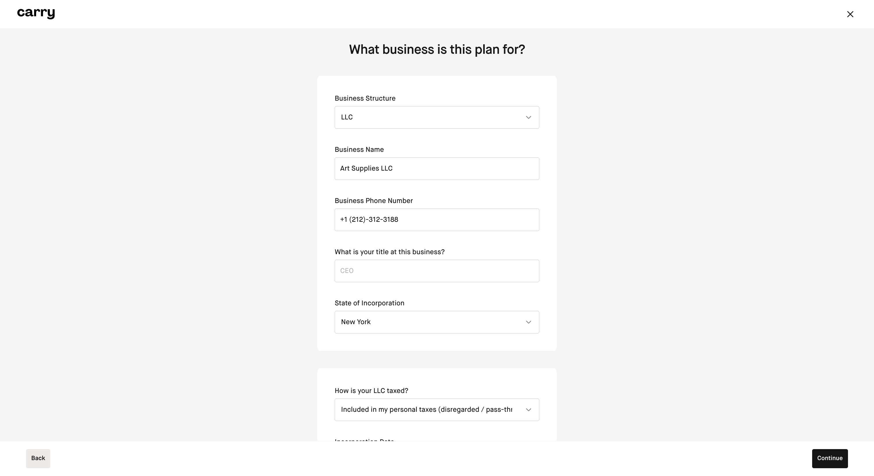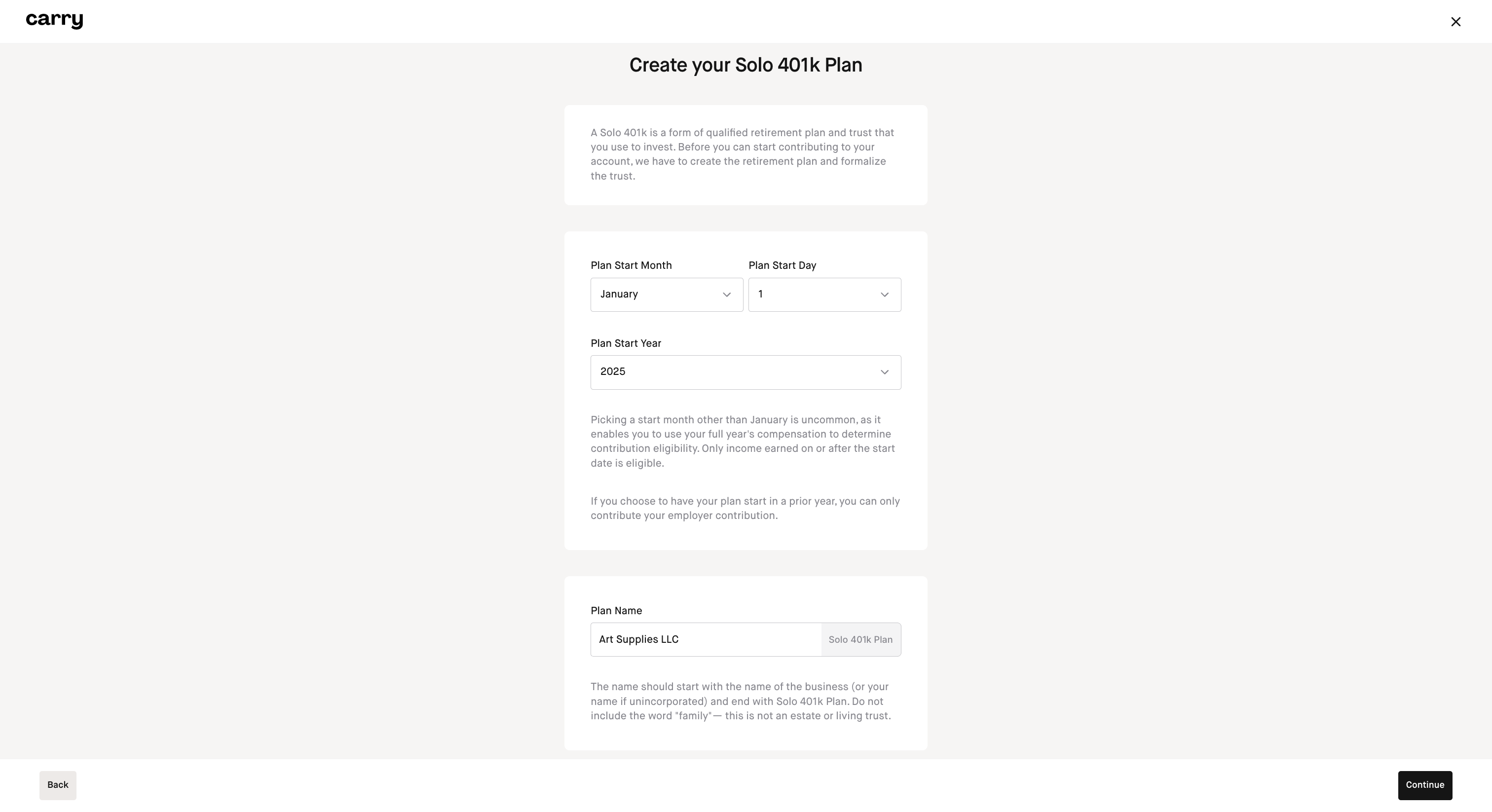 Step 5: Create your Solo 401k plan details by inputting the details and clicking 'Continue'