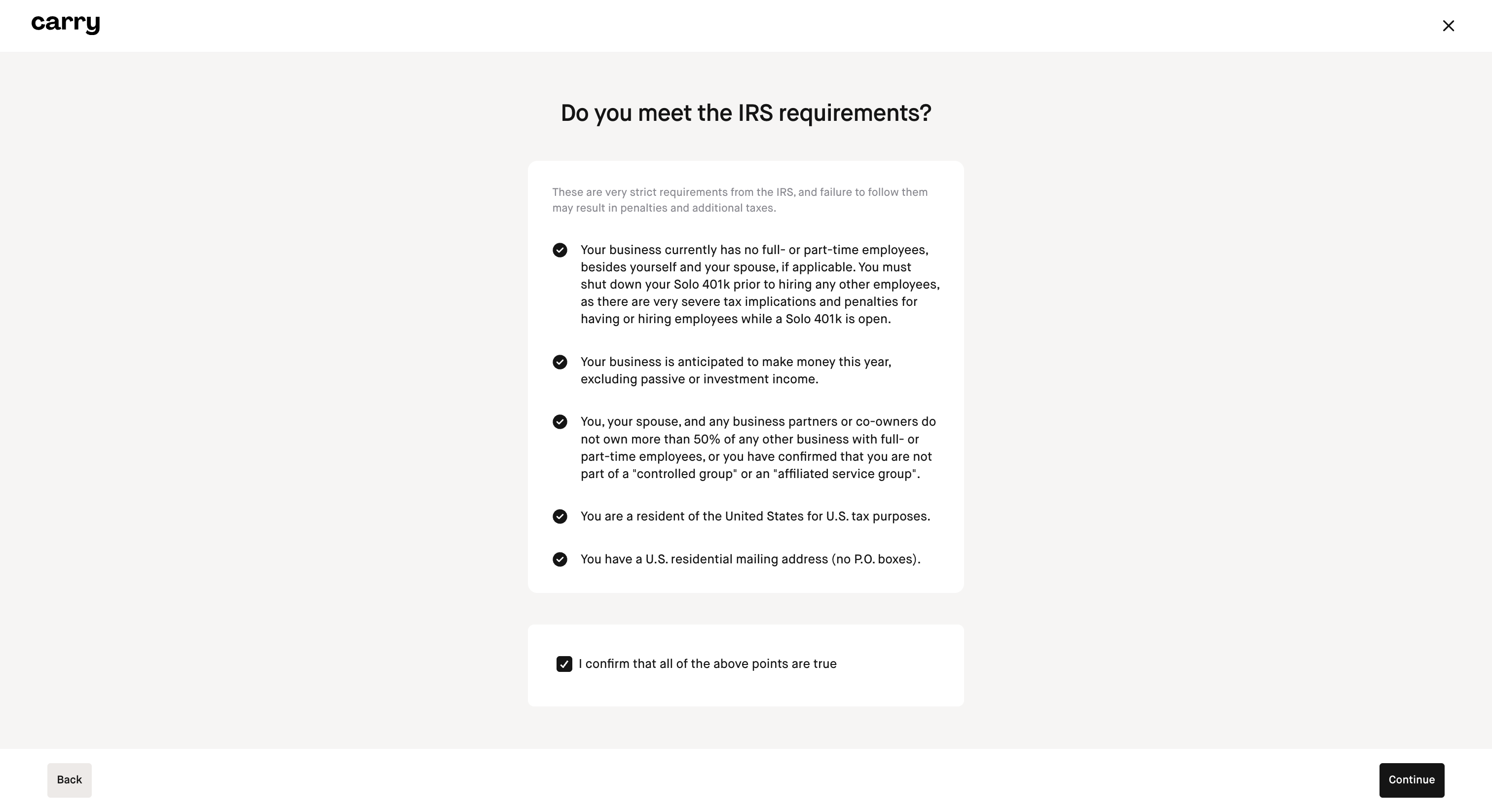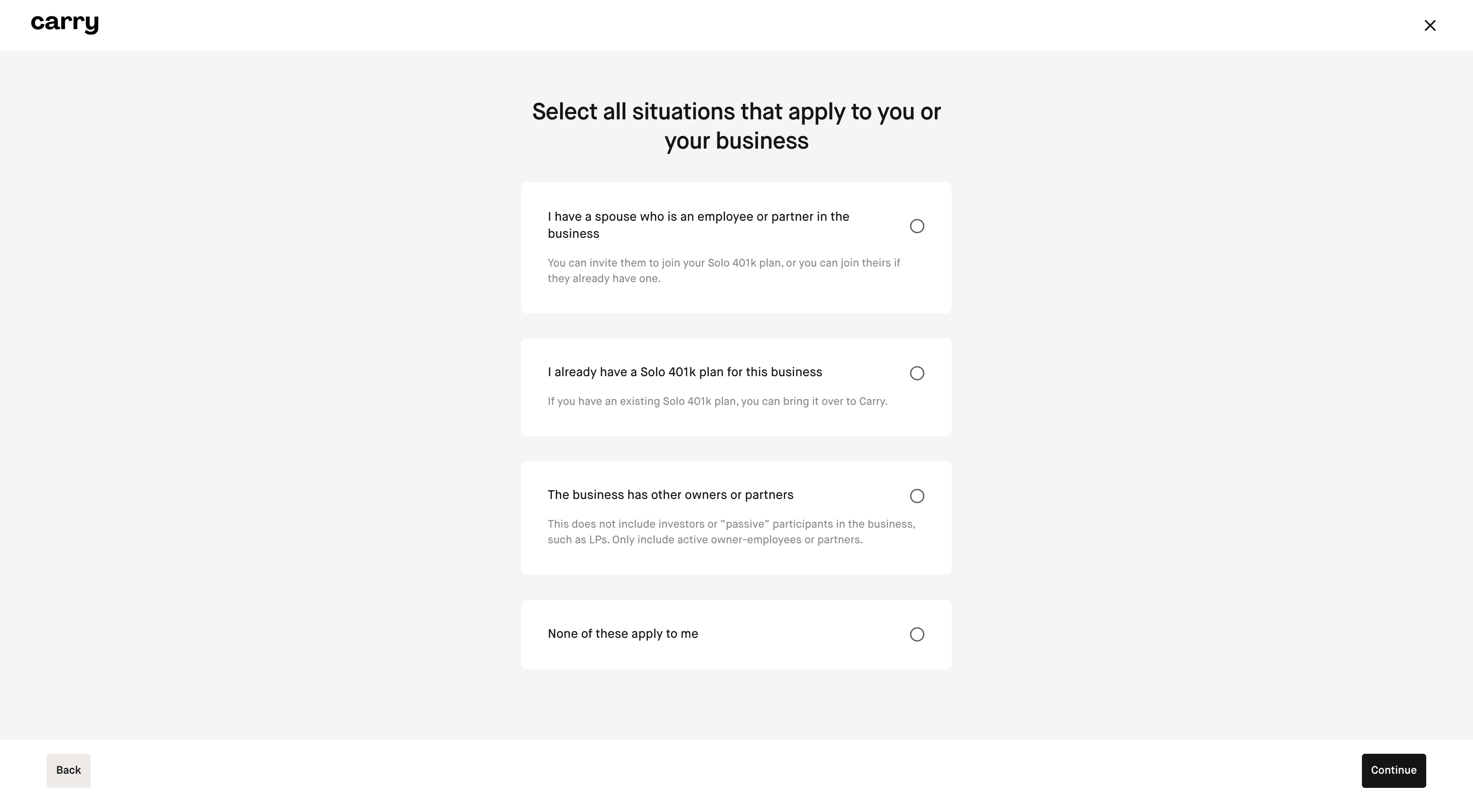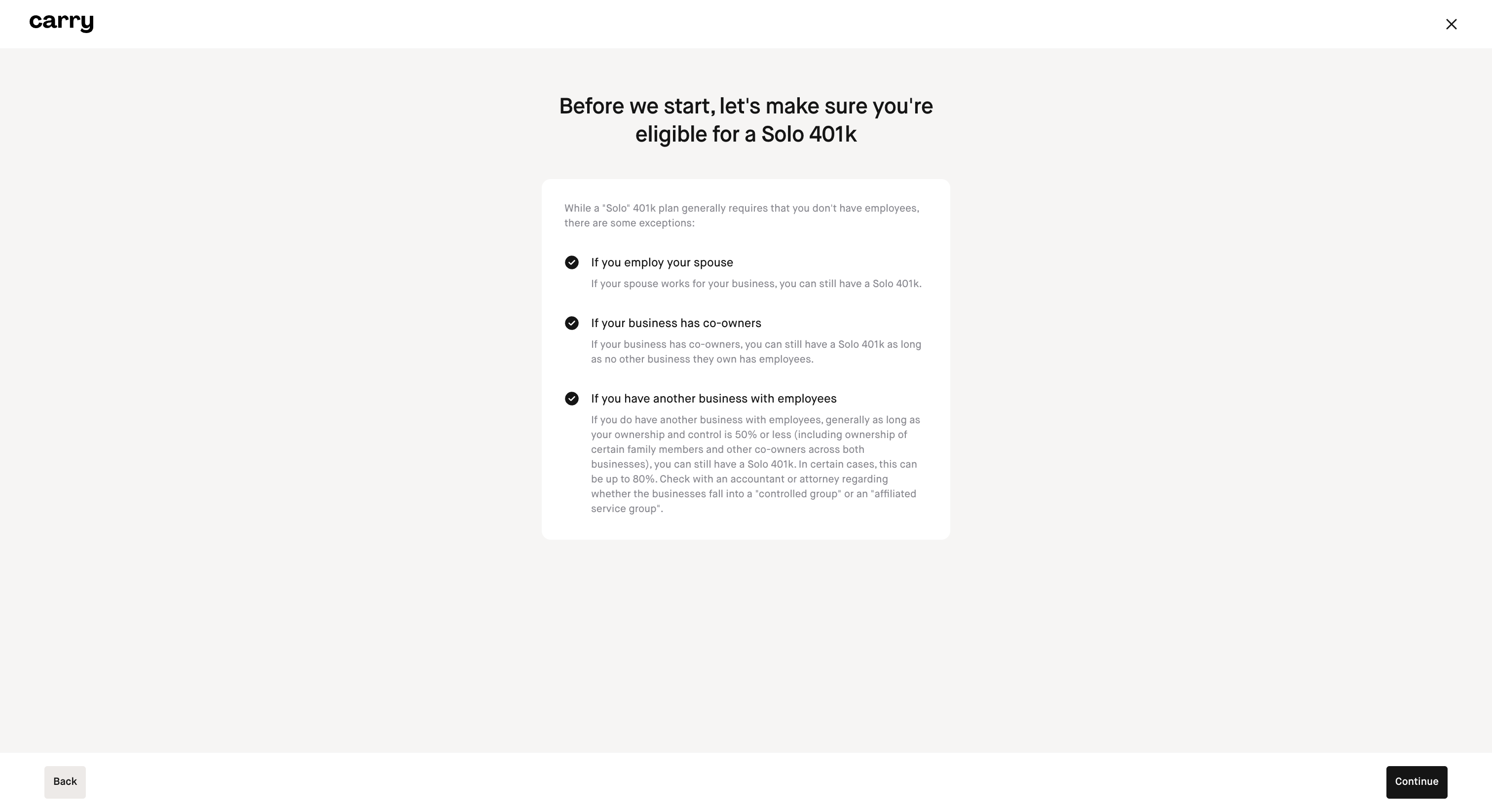 Your spouse is an employee, owner, or partner in your business (For more details on Spousal Solo 401k set up, check out this article. Each you and your spouse will need to have your own individual Carry membership to make contributions.)
