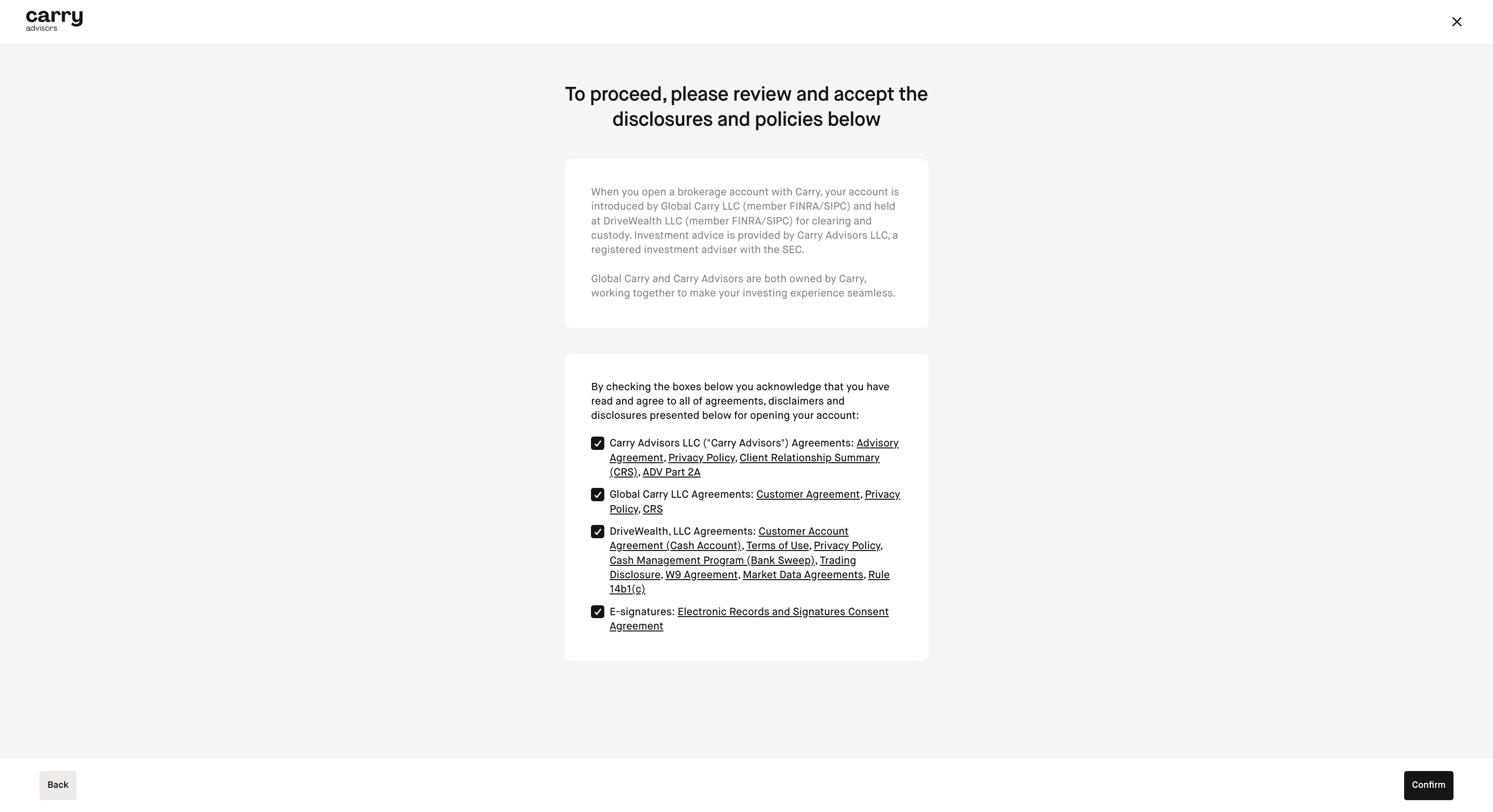 Step 16: Review and accept the disclosures and click 'Confirm'