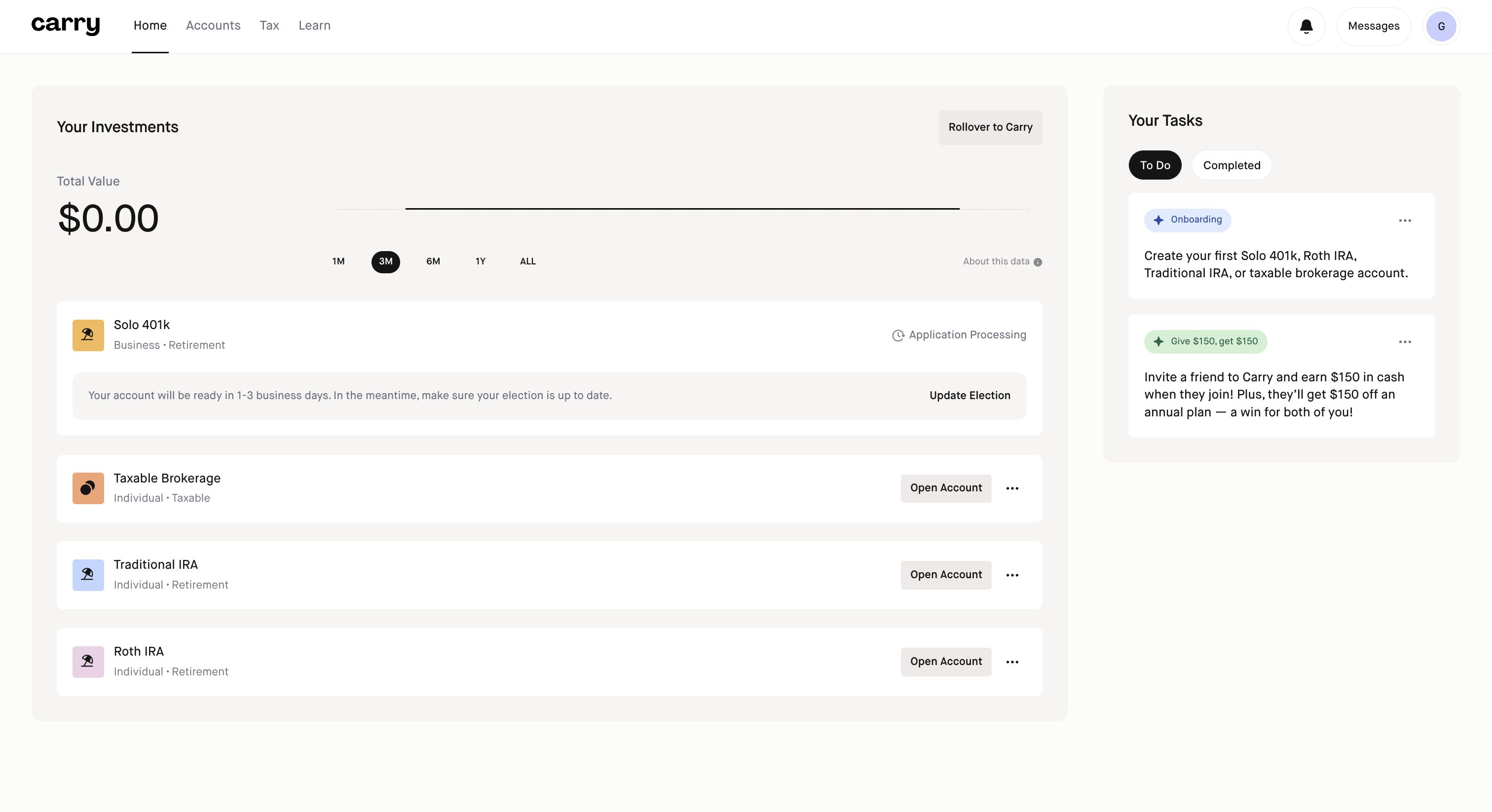 Once you complete this you will be brought to the Home screen with an estimated timeline on when the Solo 401k plan will be opened.