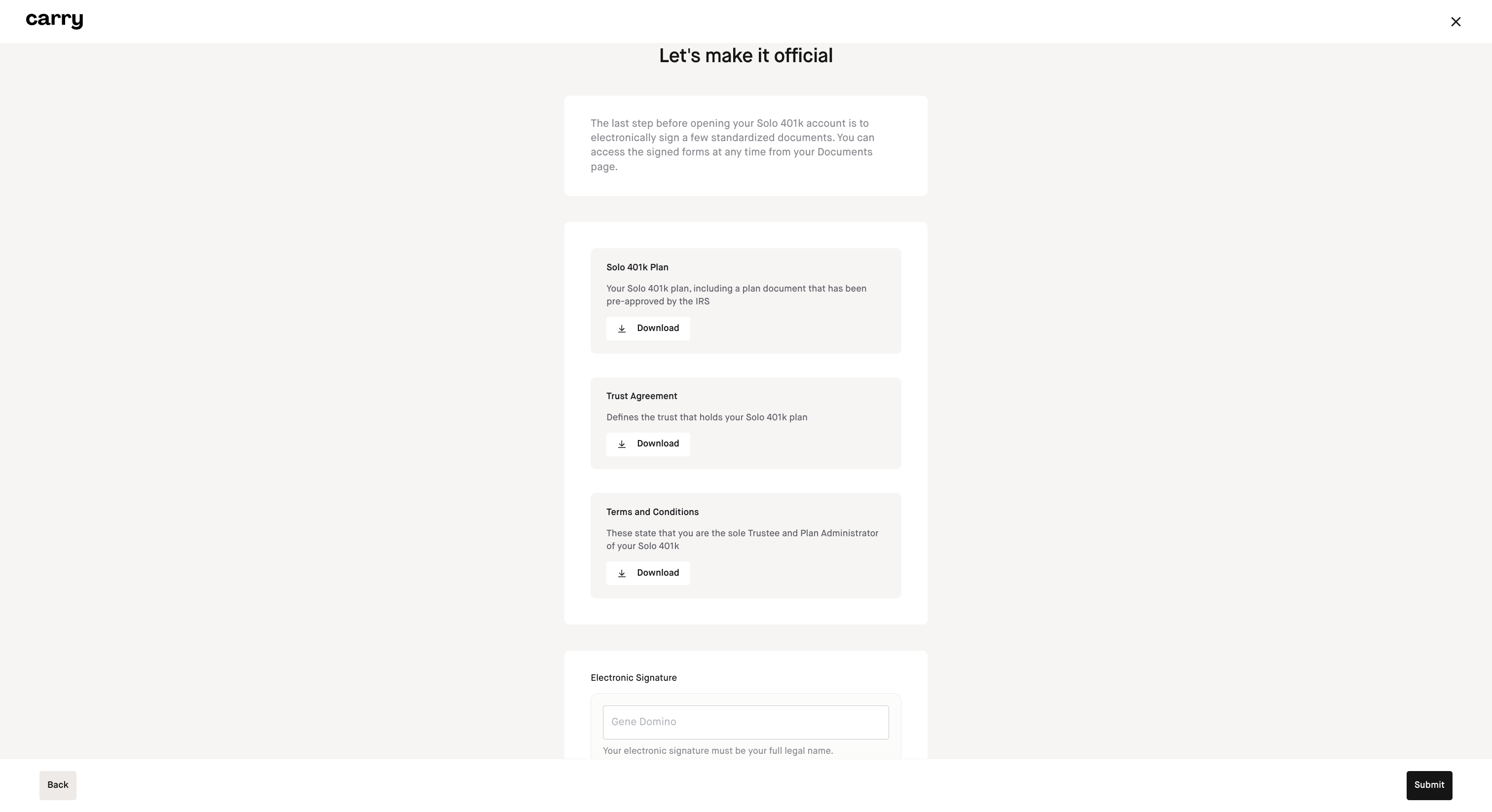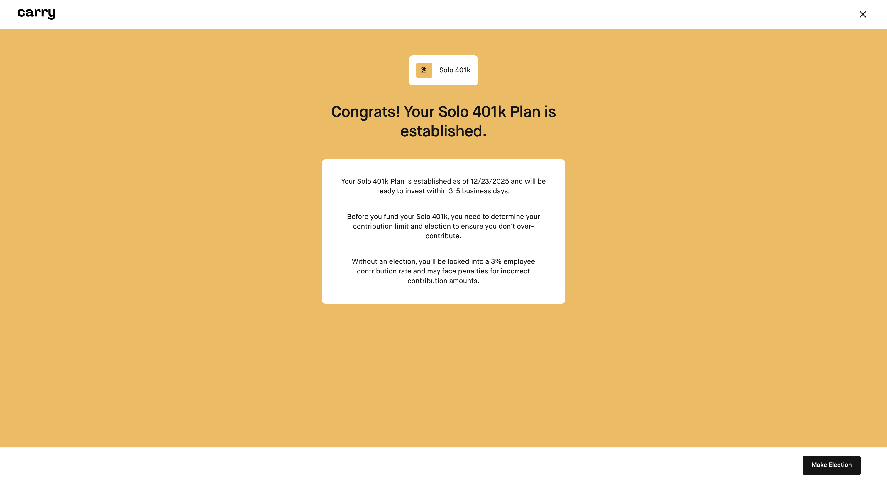 Once your Solo 401k application is submitted, our team will review it and let you know if we need any additional documents, or otherwise notify you when your application is approved. An approximate timeline for the Solo 401k plan setup to be completed will be shown below the Solo 401k on your Home page. For Solo 401k deadline information check out this article.