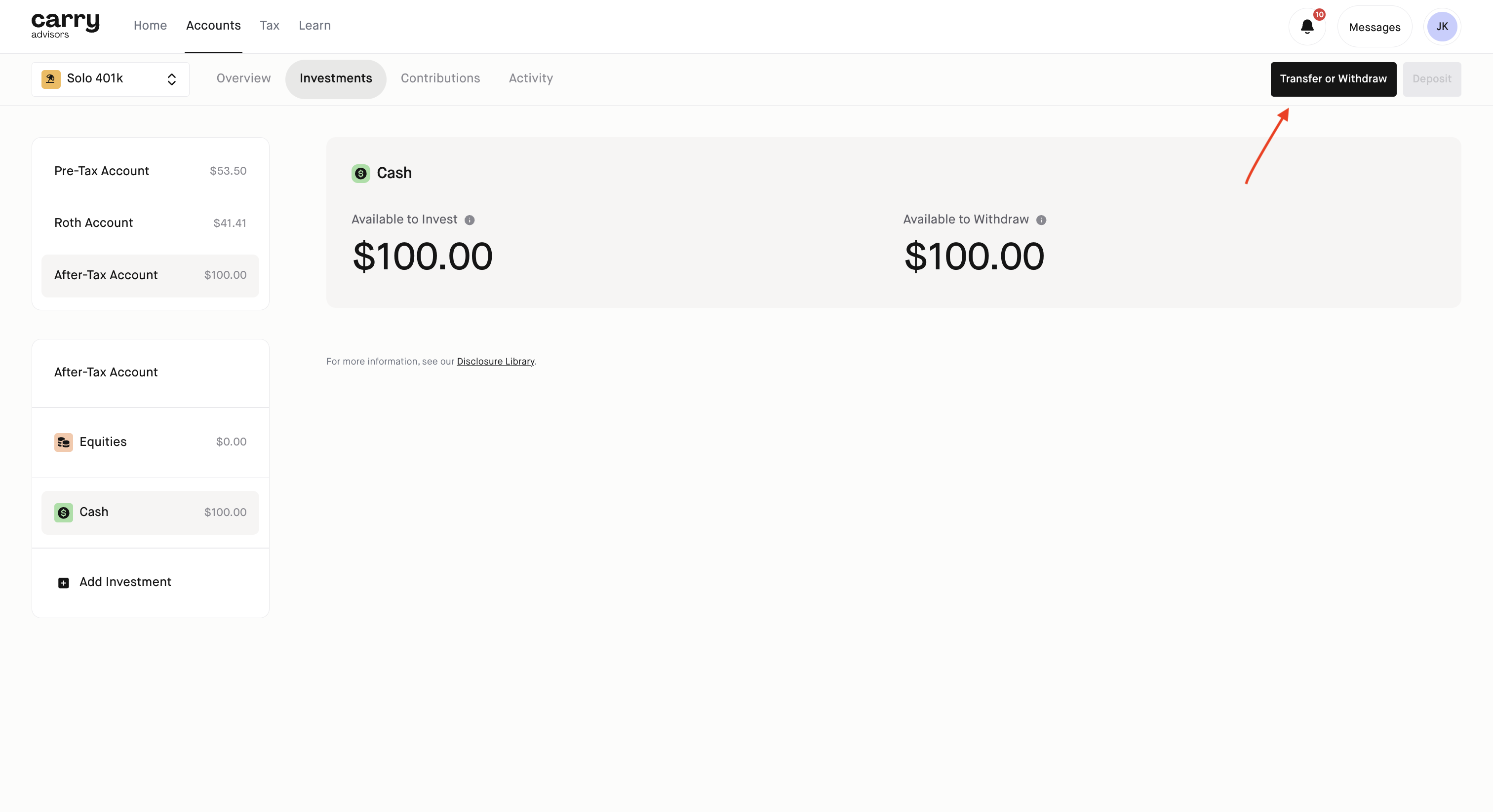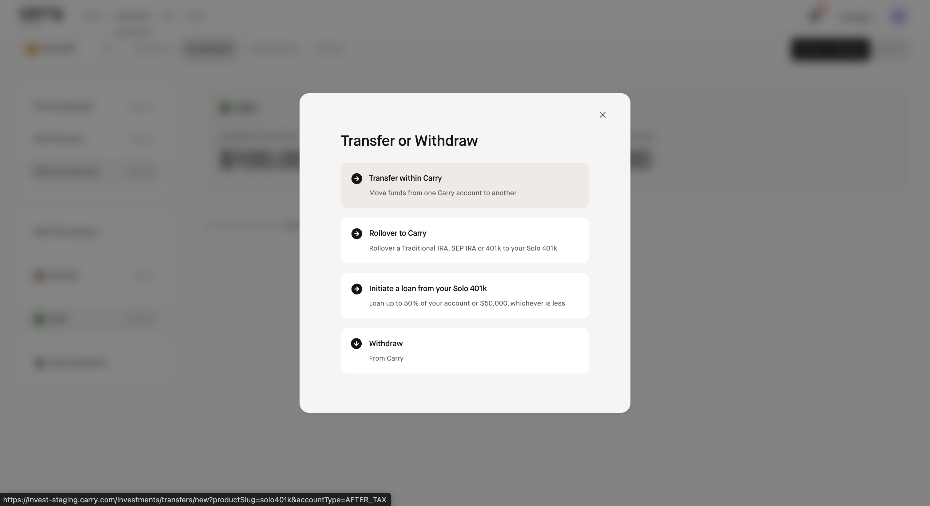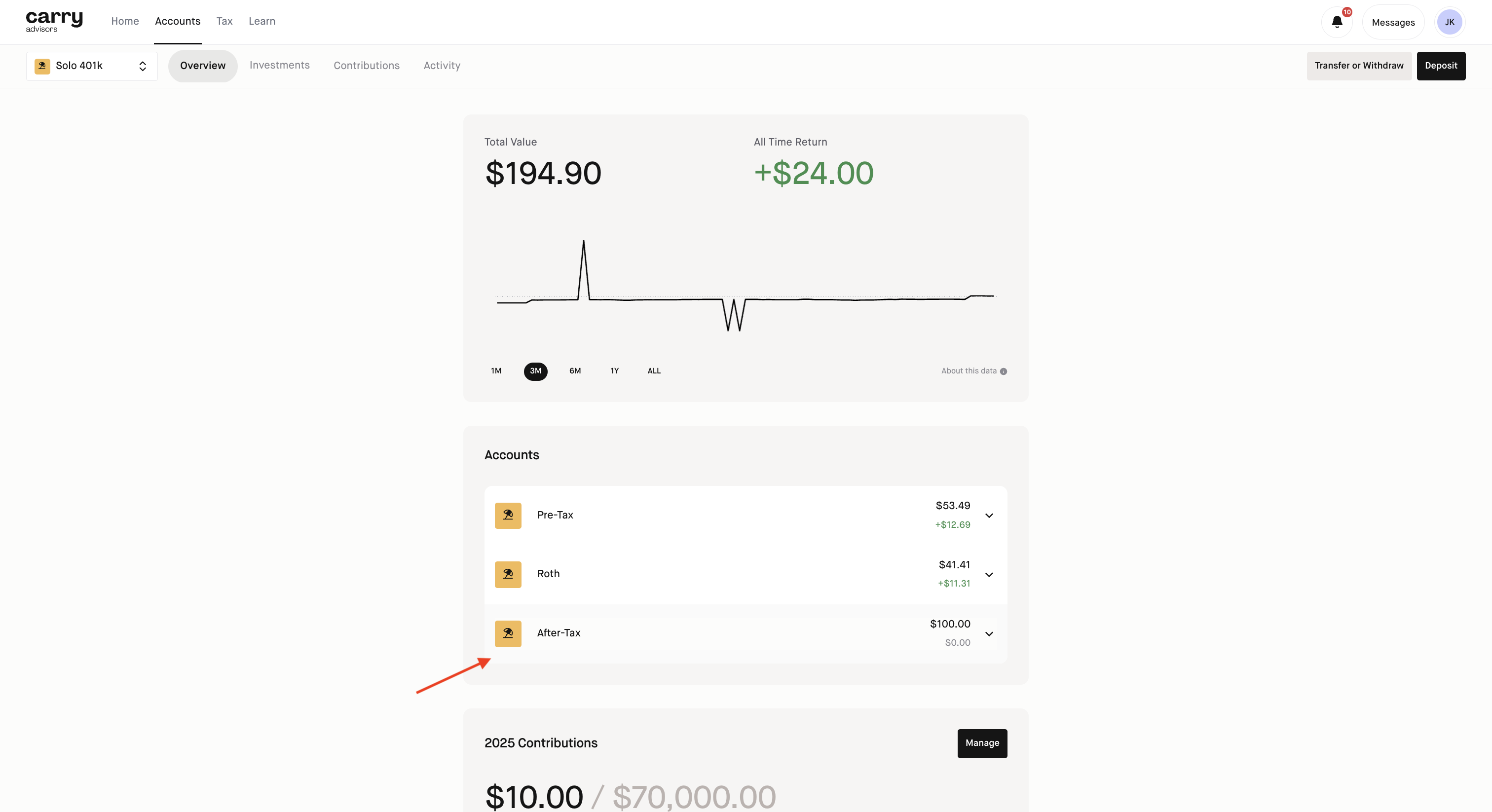 *Please note that as of December 15, 2025, Carry will no longer support new deposits or investments directly within Solo 401k after-tax accounts. This applies to clients who have legacy accounts that had this ability.