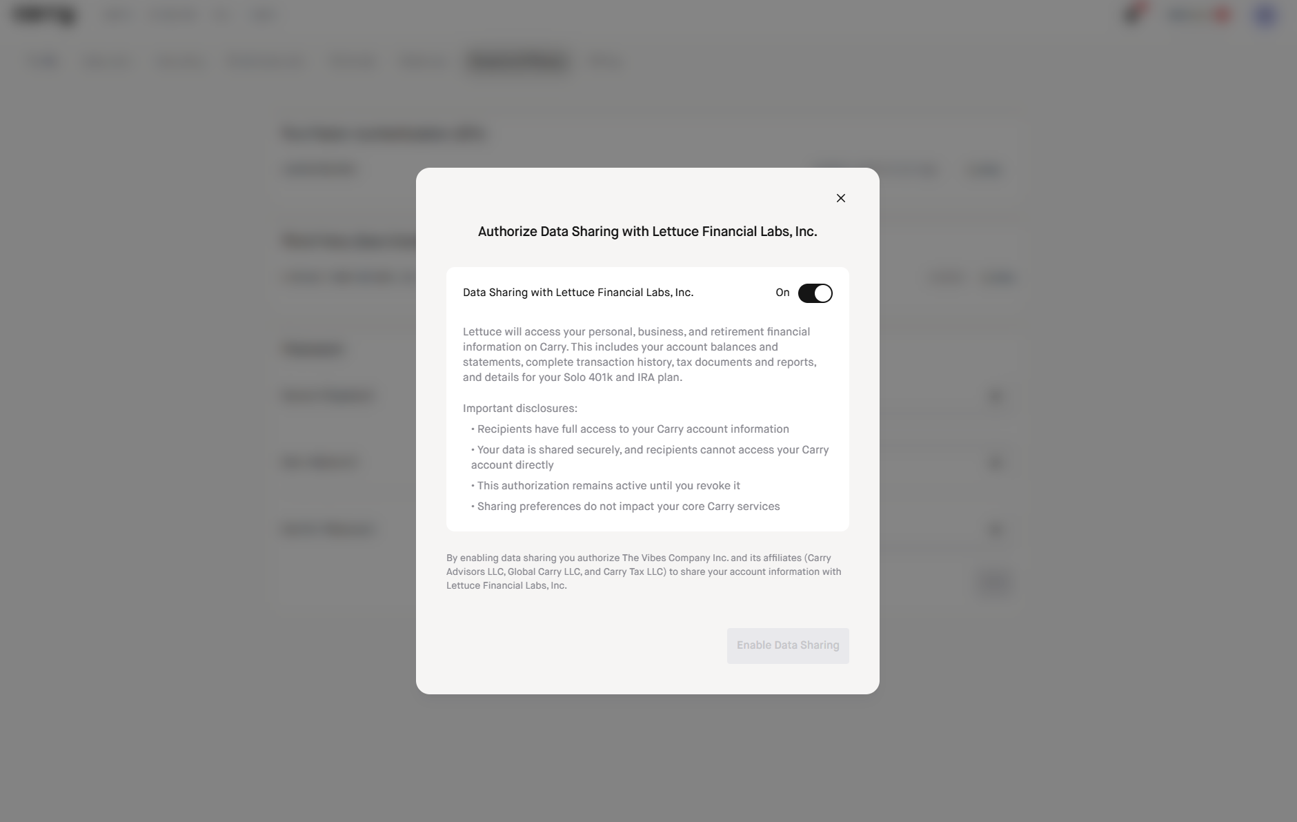 Carry clients who work with Lettuce Financial Labs, Inc. ("Lettuce") can opt in or out of sharing their financial account data through settings.